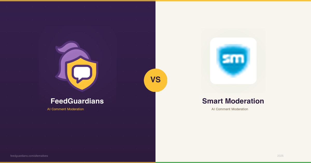 Smart Moderation hides bad comments — that's it. FeedGuardians moderates and engages: filtering harmful content while actively replying to good comments, answering questions, and building your community automatically.